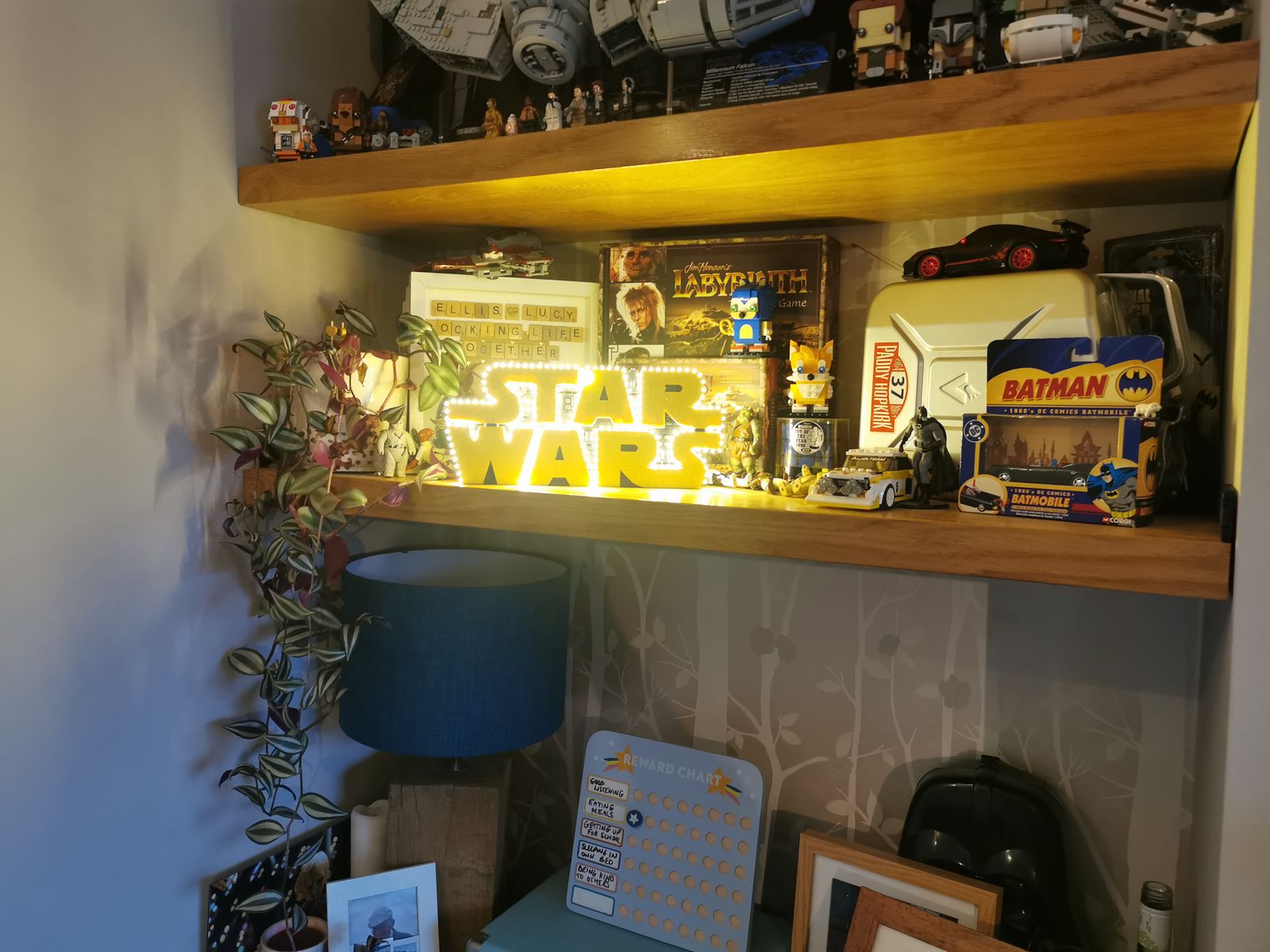 This frameless sign rests easily on any flat surface and becomes a standout centerpiece for your LEGO Star Wars collection, media shelf, or home office.