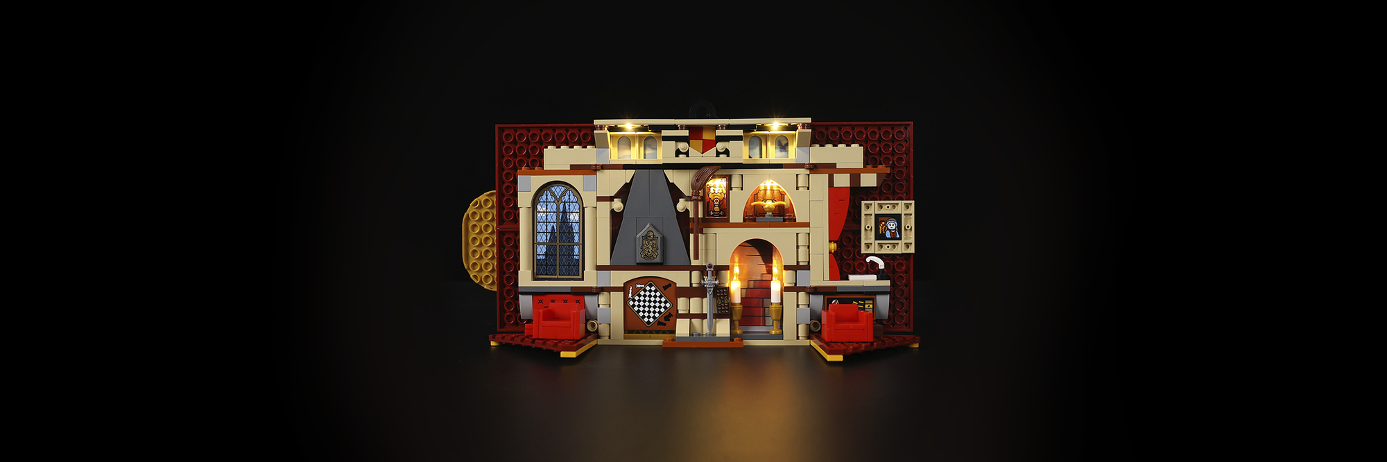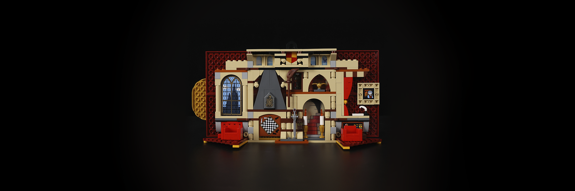 The buildable banner features the Gryffindor crest and opens up to reveal a brick-built common room complete with a fireplace, seats, candles, and a chessboard, perfect for imaginative play.
