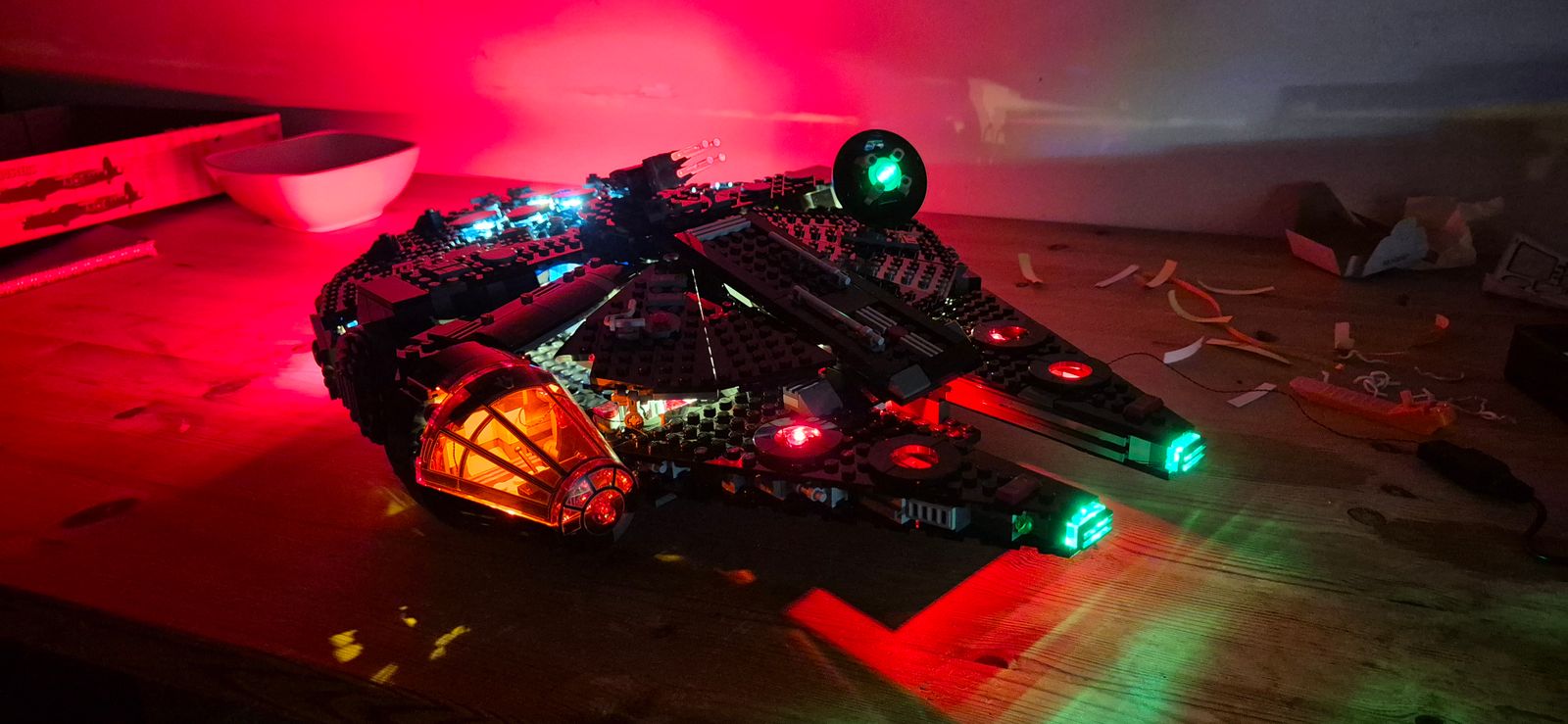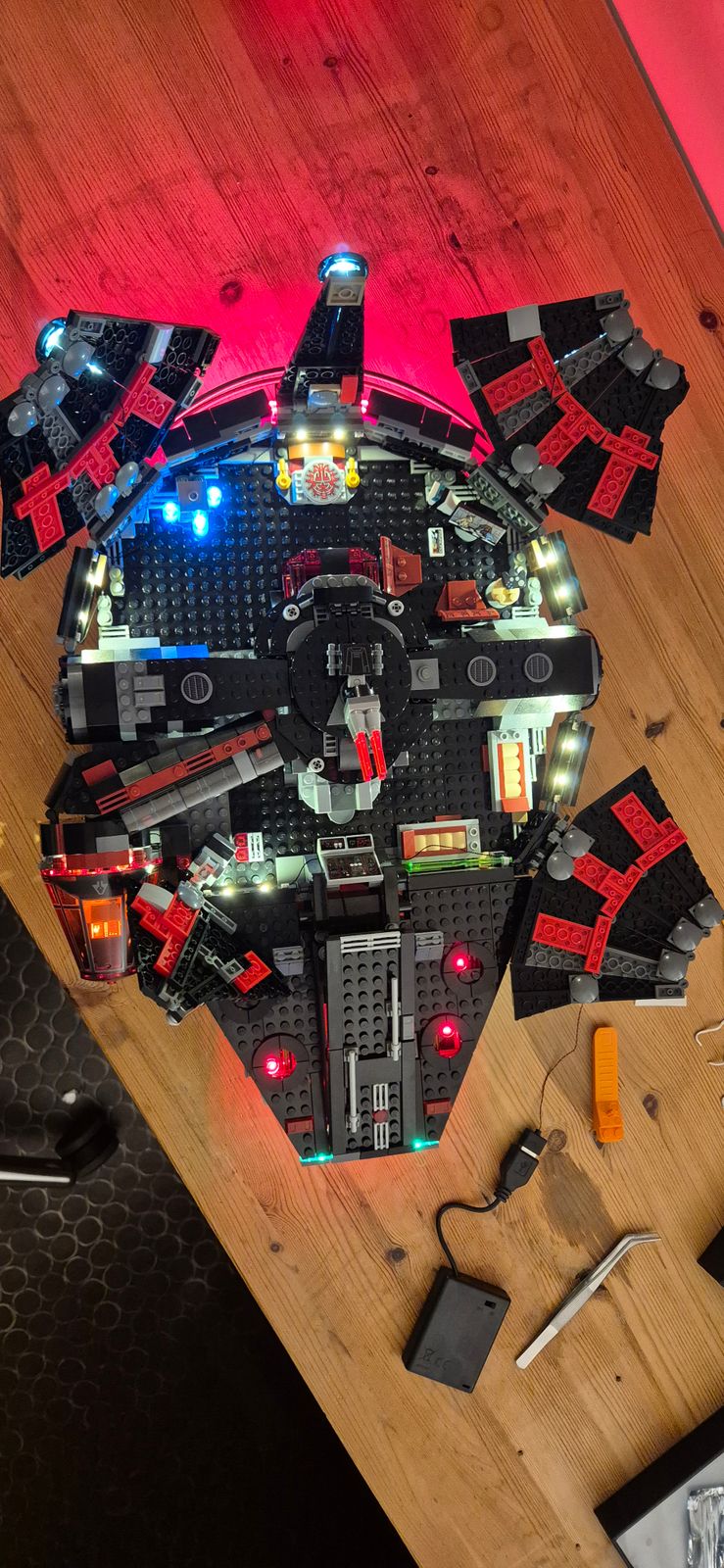 Build The Dark Falcon, a dark version of the Millennium Falcon as seen in the Rebuild the Galaxy Disney+ special, to turn the universe upside down, now illuminated by LEGO lights.