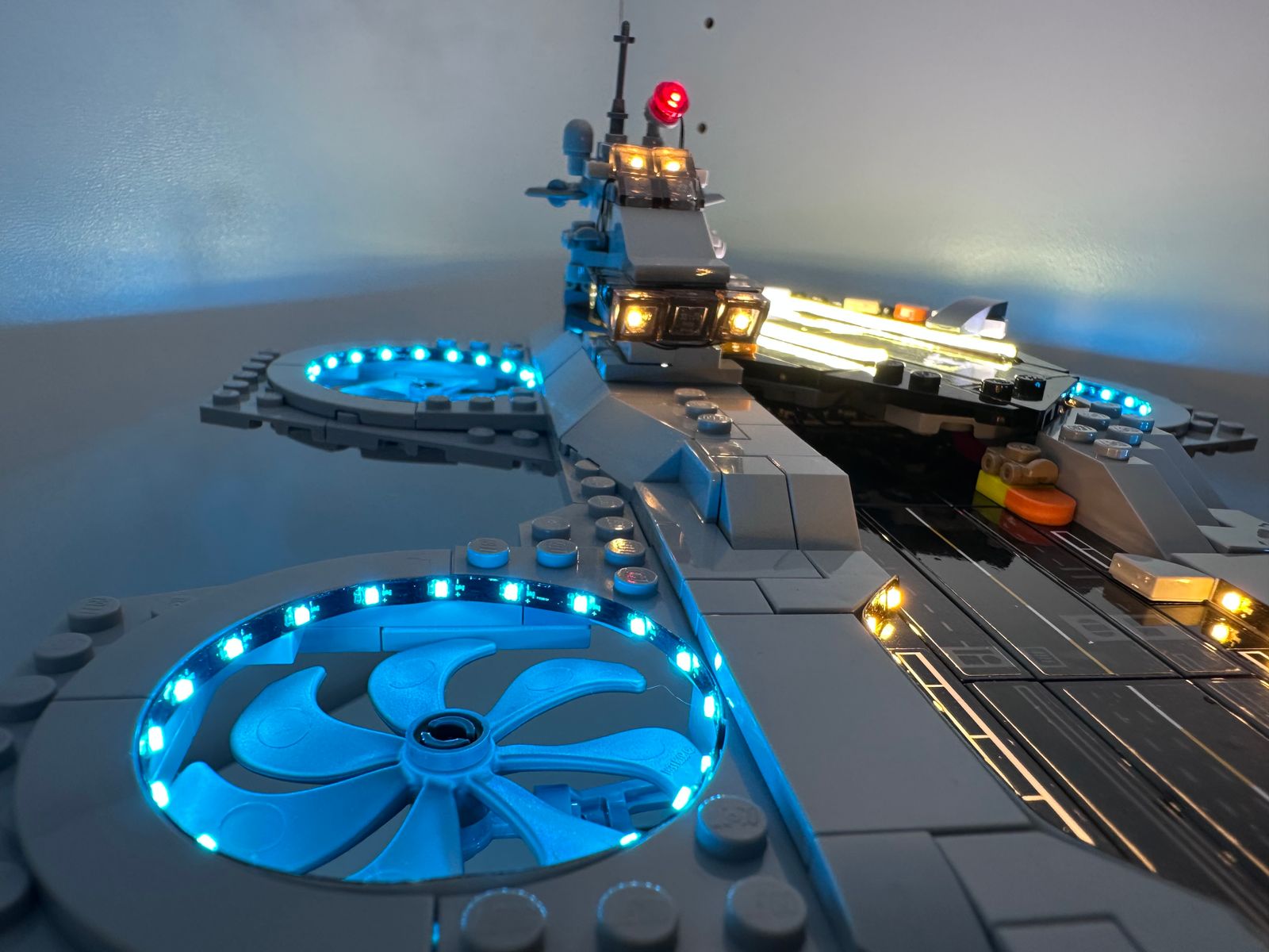 This buildable LEGO Marvel aircraft carrier model is designed for adult fans of Super Hero movies and experienced model enthusiasts, now enhanced with LEGO lights for a captivating display.