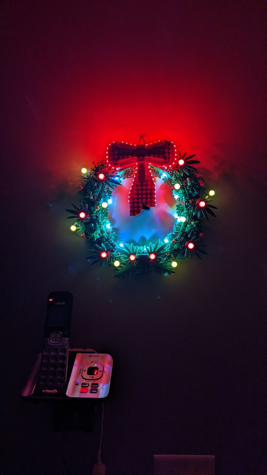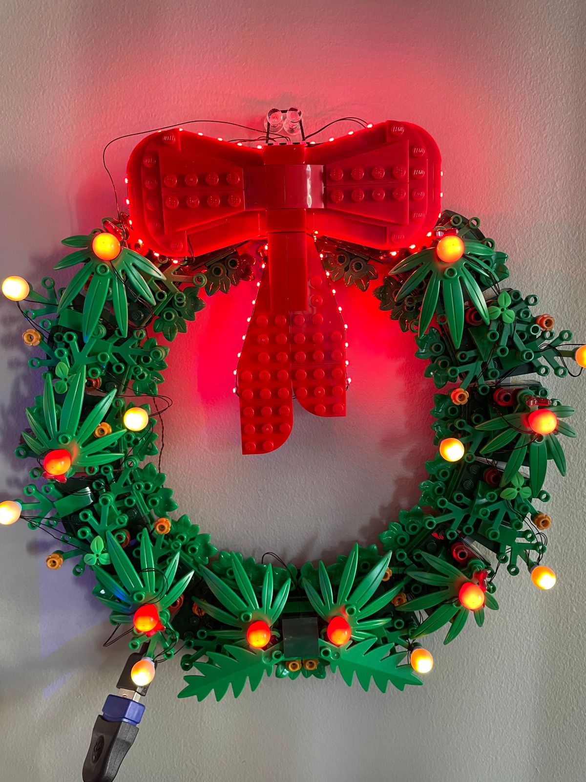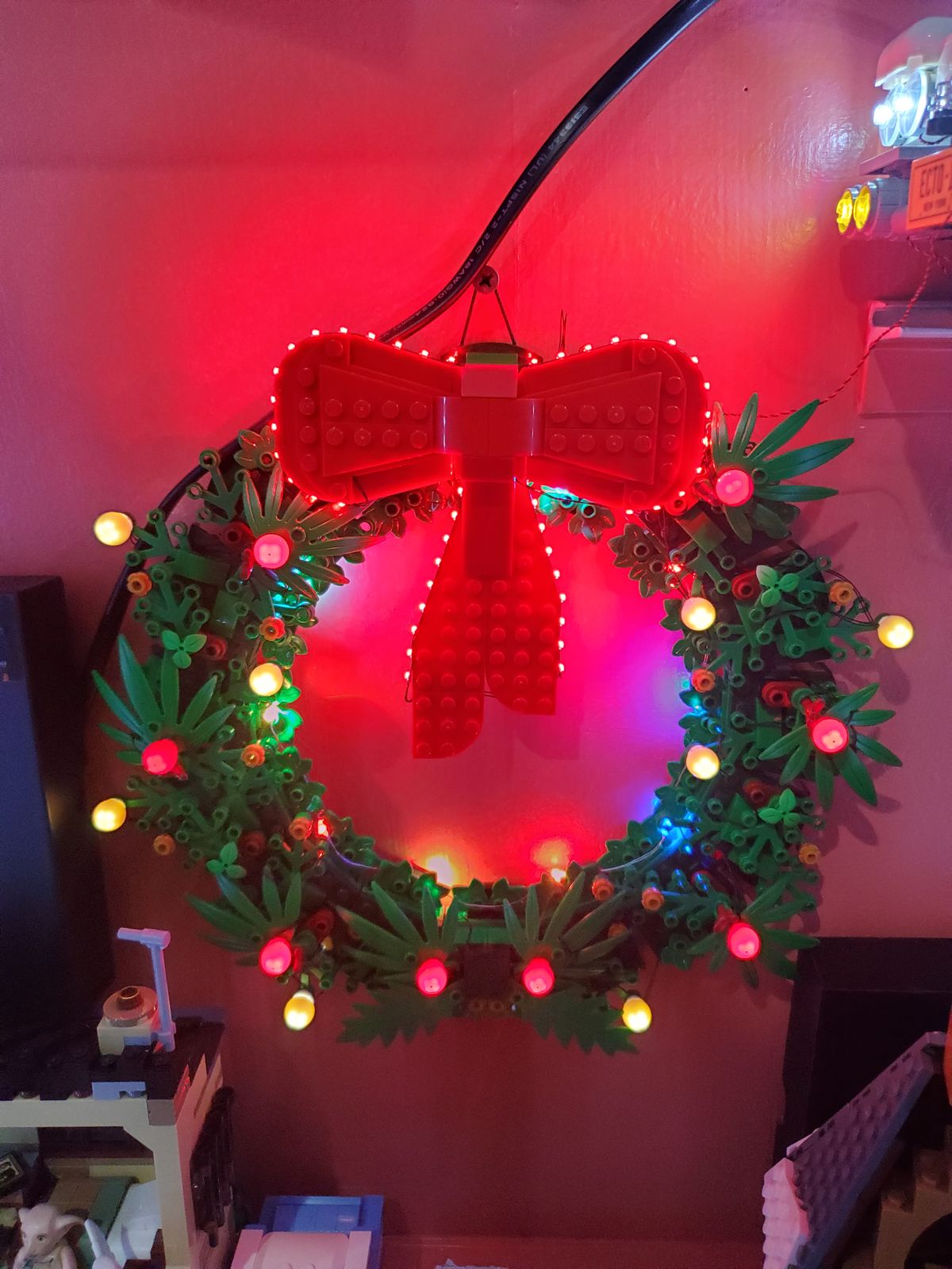 The Lego wreath was lovely but the lights just made it so much better, Amazing when lit up can’t wait to hang it up this year