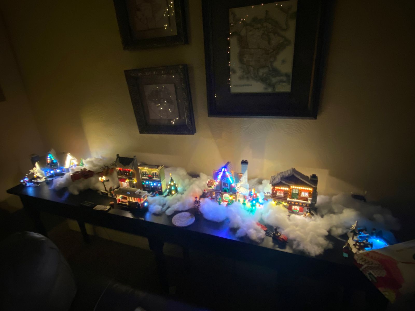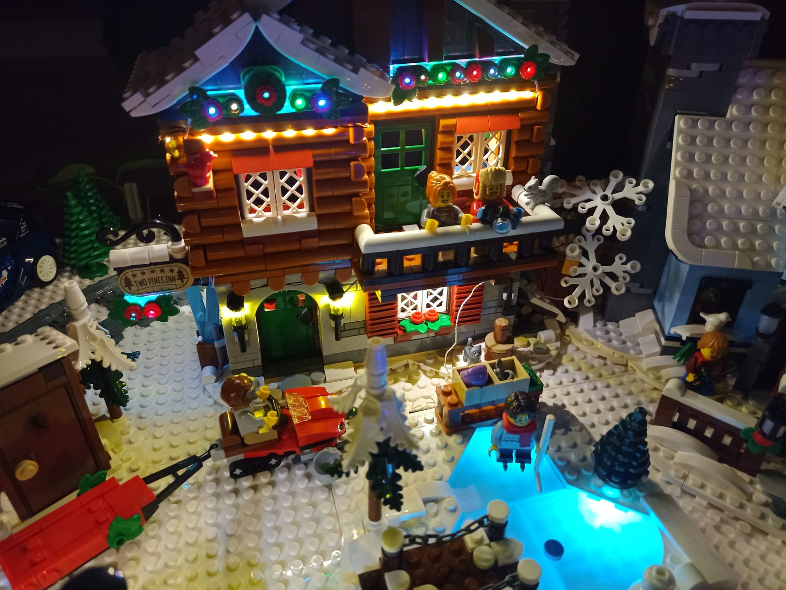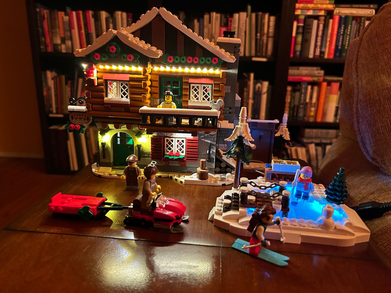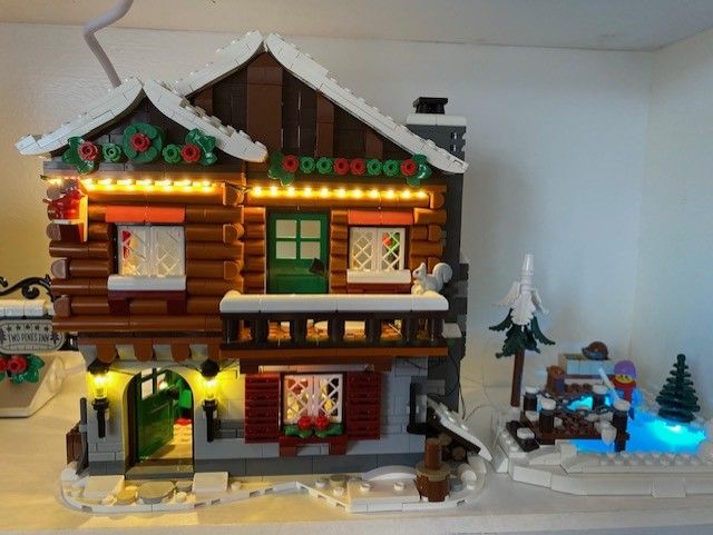 Upon completion, the lodge stands tall at over 8 in. (21 cm) high, 9.5 in. (24 cm) wide, and 6 in. (16 cm) deep, serving as a splendid display that beautifully captures the essence of winter, especially when adorned with LEGO lights.