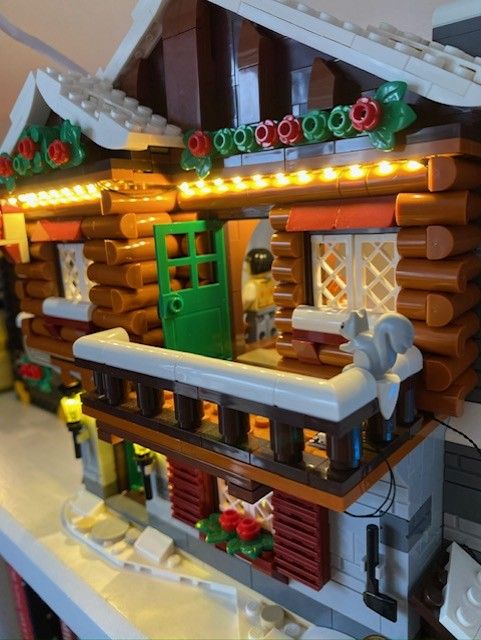 Boasting 3 elaborate levels, the lodge paints a picturesque scene. From a cozy reception, complete with an illuminating log fire and coffee corner, to guest rooms that beckon with warmth, every floor tells a story. Enhanced by LEGO lights, the fireside glow becomes even more inviting, promising comfort amidst the cold.