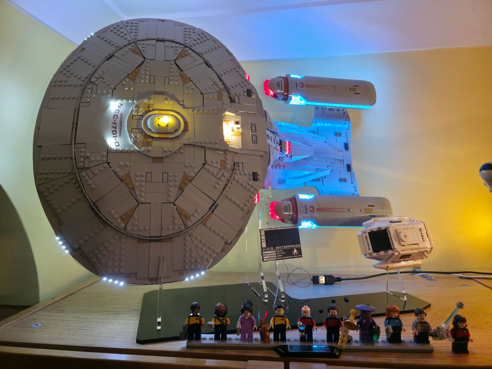 Key Features: Detachable saucer, opening shuttlebay, warp nacelle lighting, minifig showcase tile with LEDs, illuminated engine cores