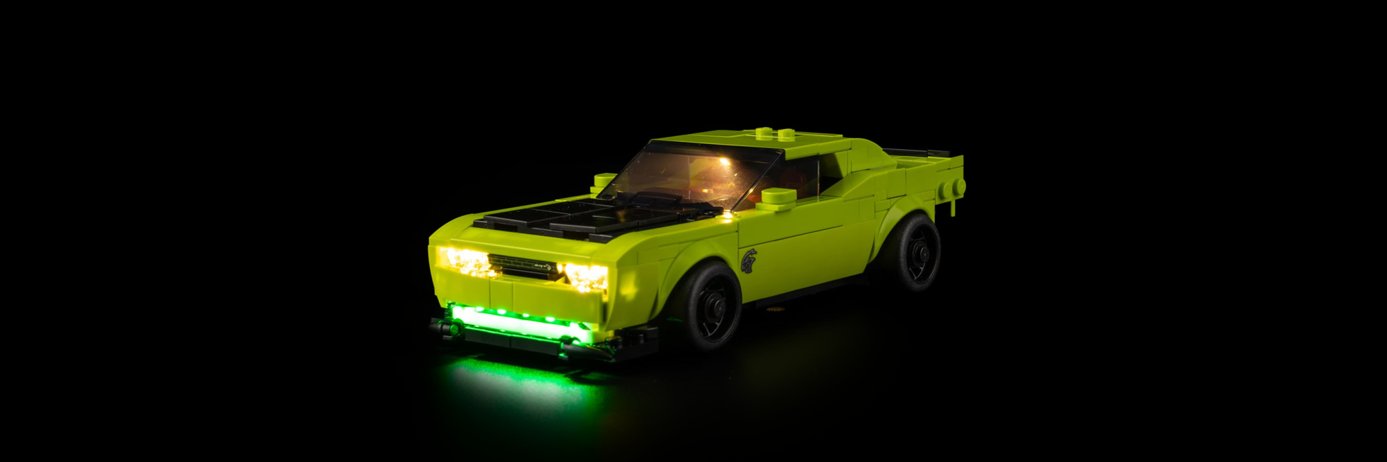 Unleash raw American power with LEGO® Dodge Challenger SRT Hellcat 77237, enhanced by Game of Bricks Lights for LEGO® to turn this modern muscle car into a bold, glowing display beast.