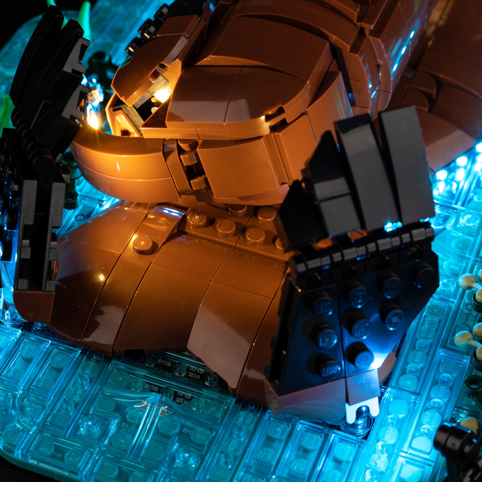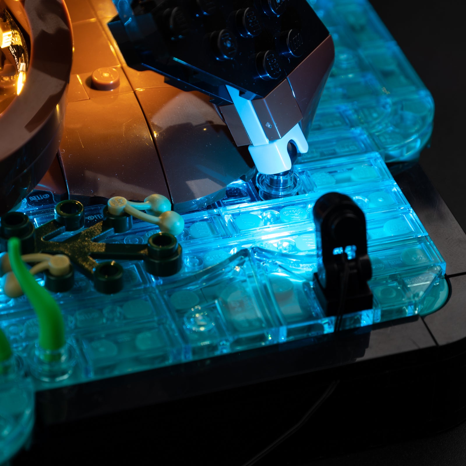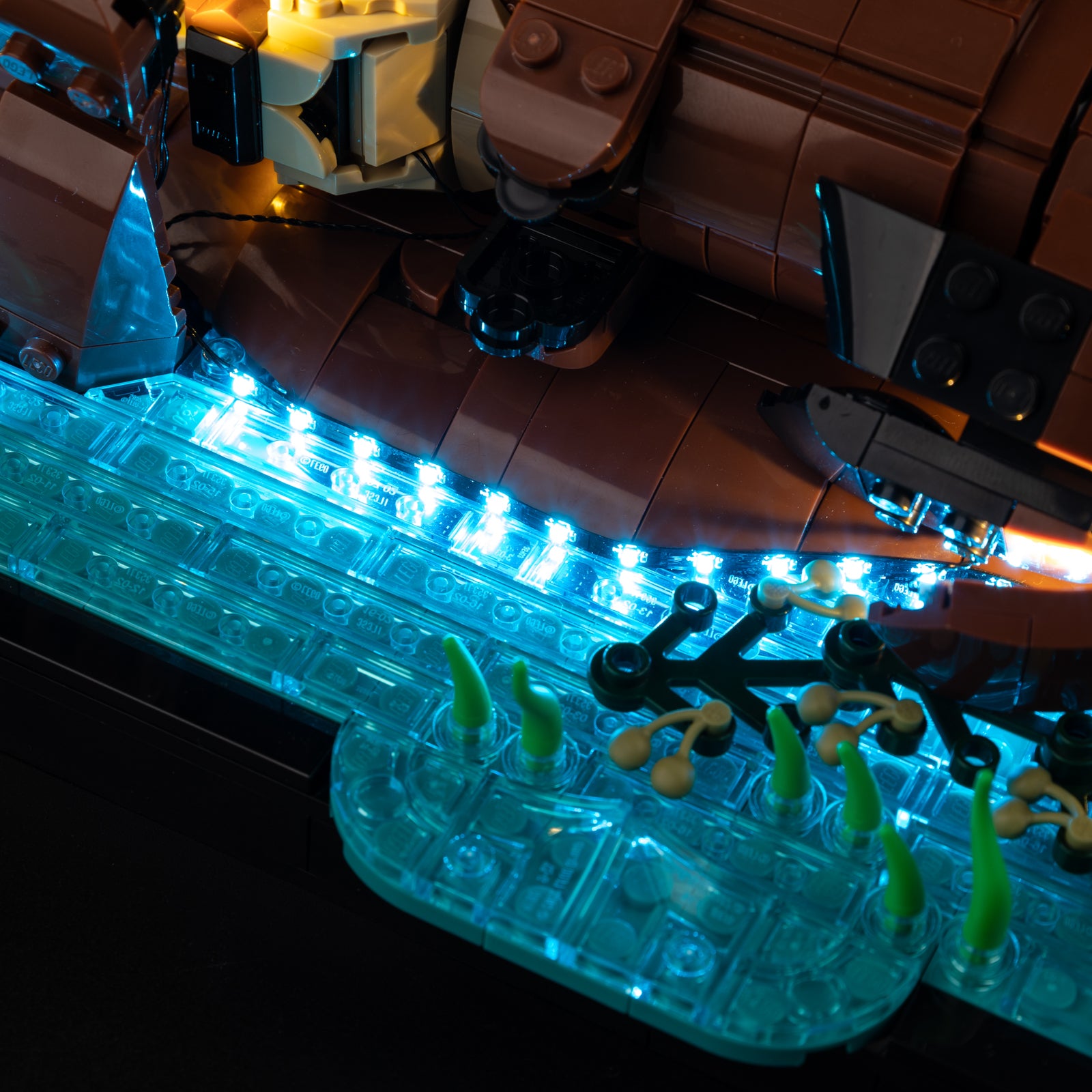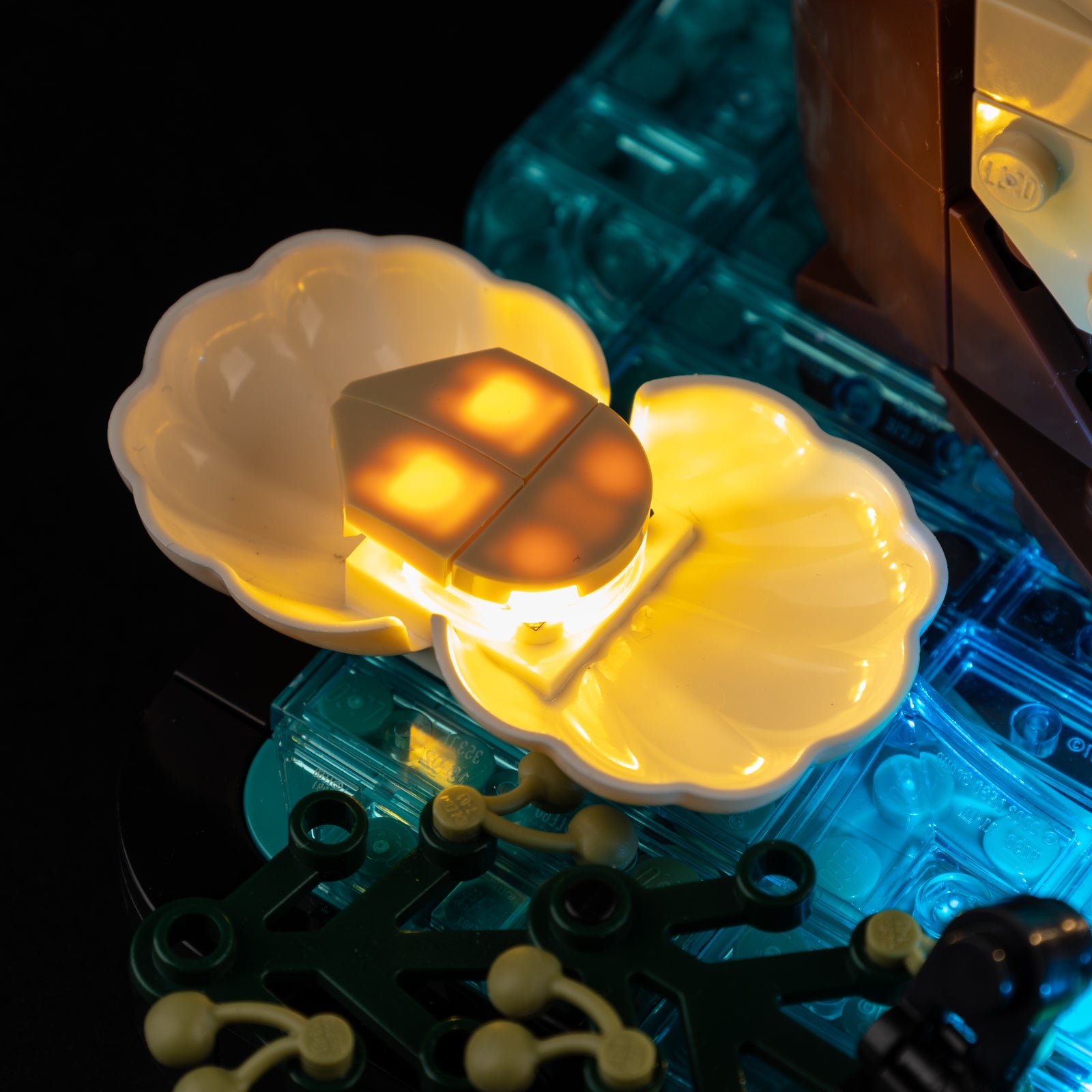 From the posable head, flippers, and claws to the optional buildable clam, every element becomes more vivid and lifelike under soft illumination.