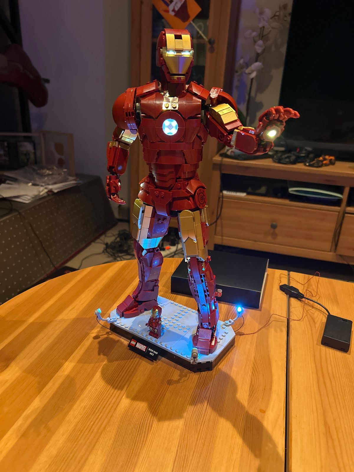 The included minifigure in Mark 3 armor becomes an eye-catching companion piece when lit next to the towering figure. Add atmosphere to any shelf, desk, or collection display.