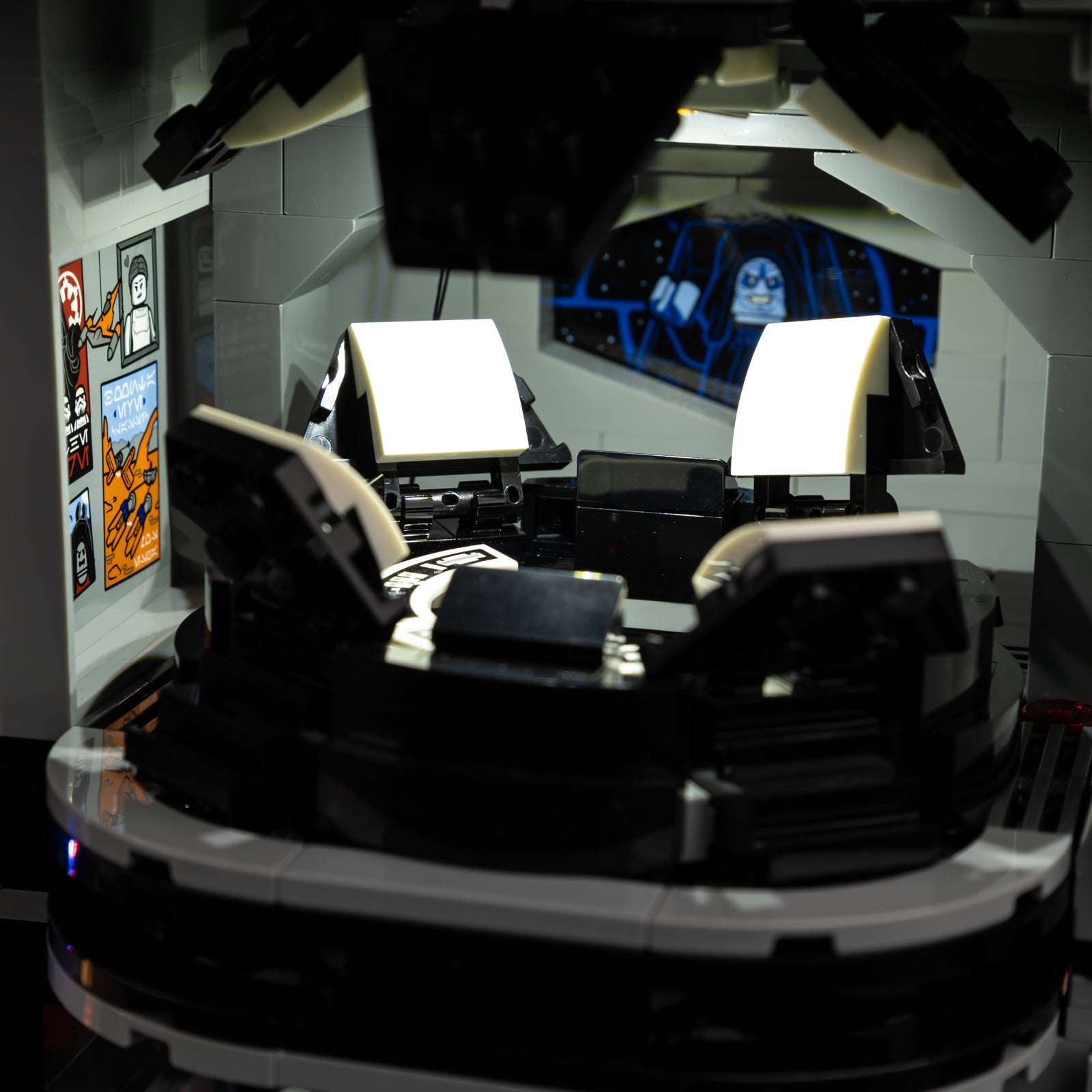 Watch the throne room glow with sinister red LED lights. Light up the Superlaser, hangar bay, trash compactor, and prison blocks — each scene enhanced with cinematic brilliance. LED spotlights guide your focus through the chaos of the Death Star's interior — from Jedi duels to daring escapes.