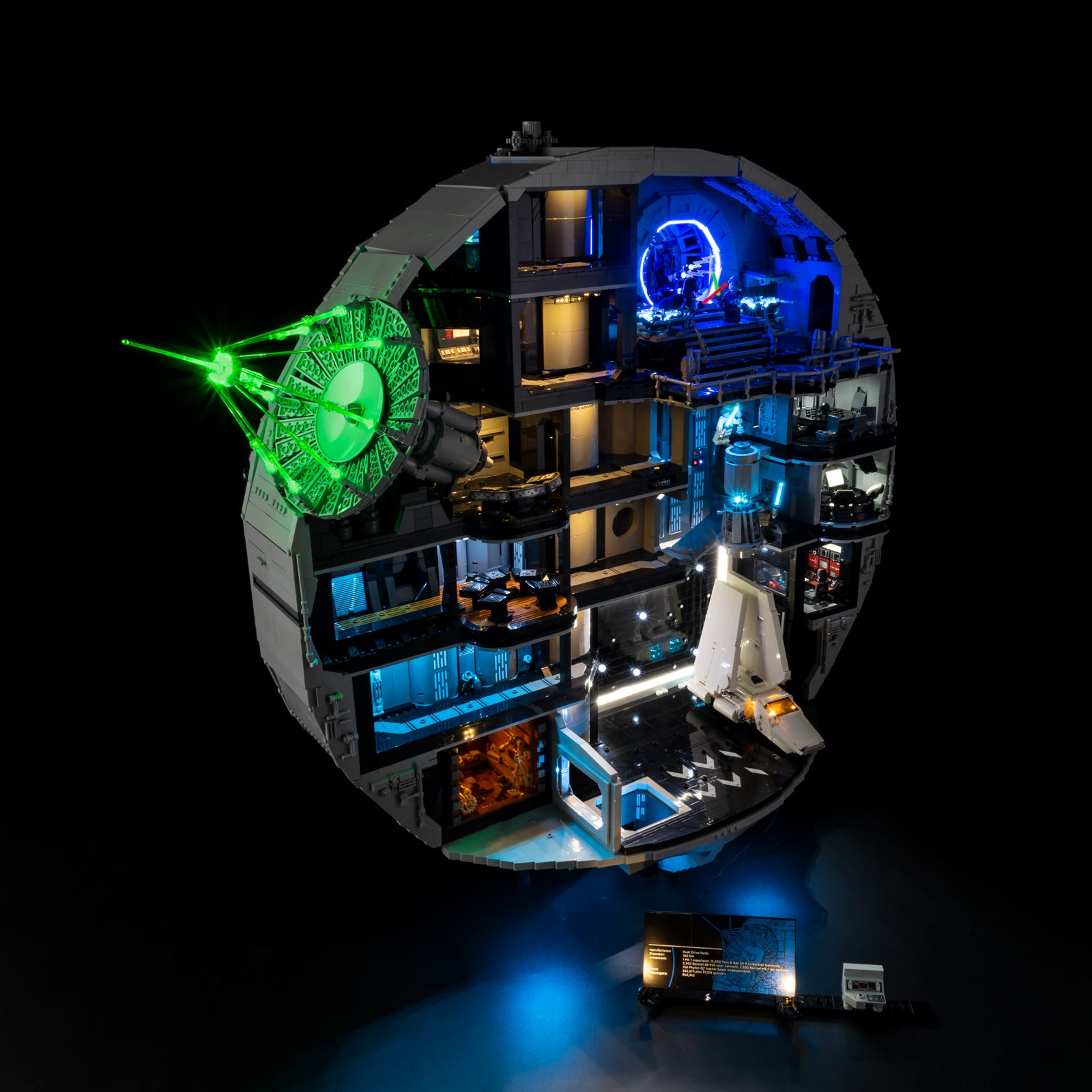 Key Features: Superlaser LED beam, throne room lighting, glowing trash compactor, backlit tractor beam, interior spotlight zones, and underglow hangar illumination