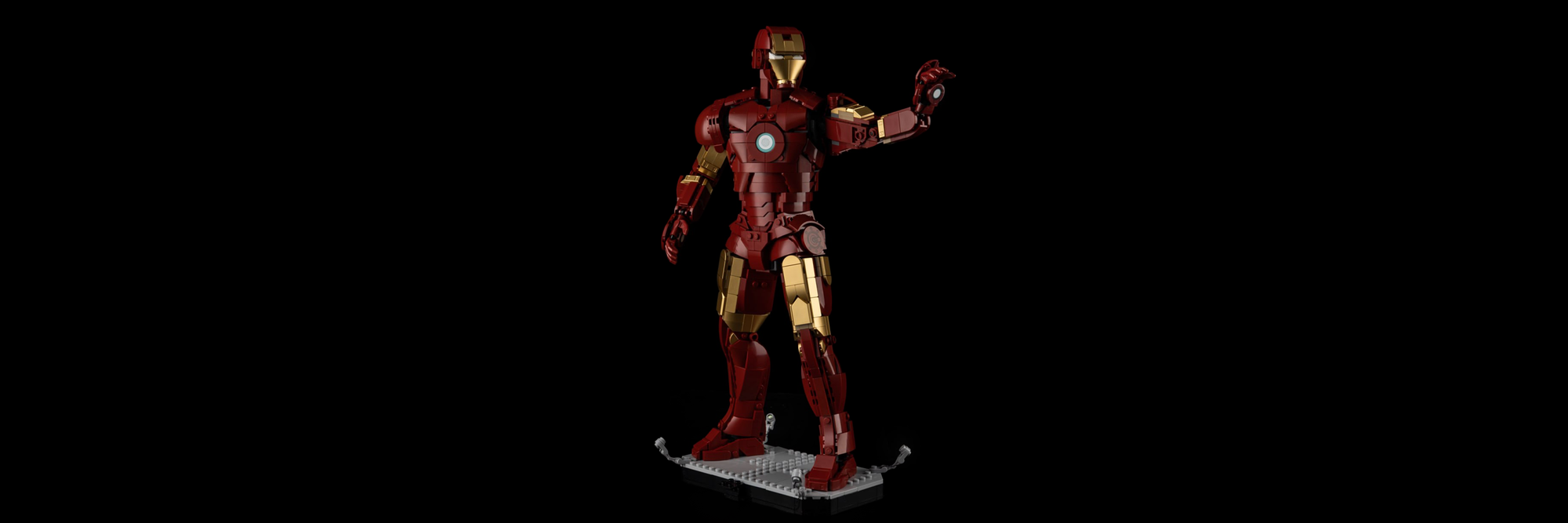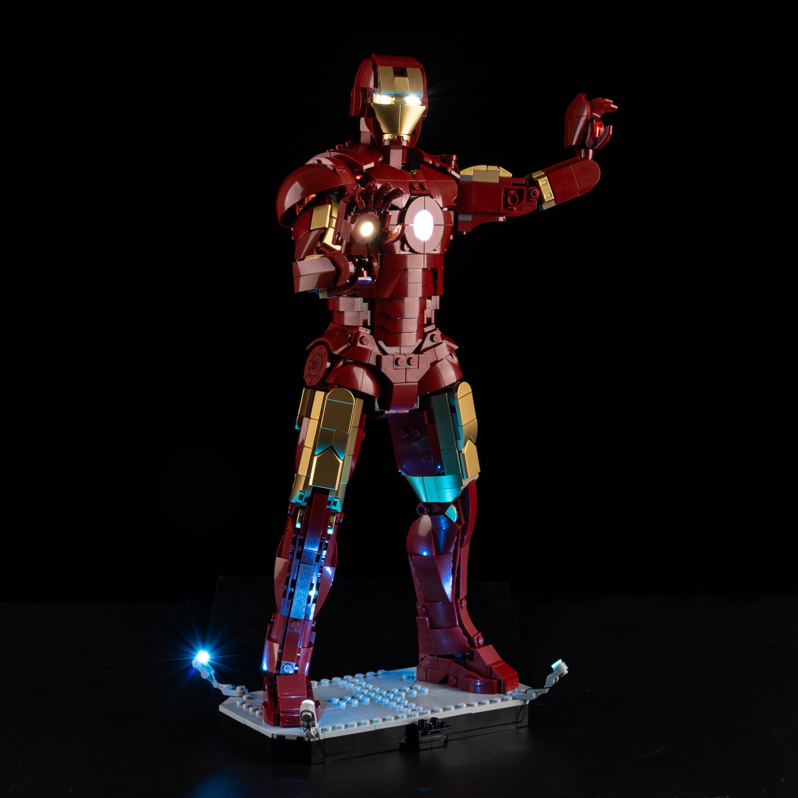 Showcase Iron Man’s Mark 3 suit in heroic fashion by lighting up the Arc Reactor, gold-lacquered armor accents, and the detailed baseplate. The result? A dramatic display piece that looks straight out of Avengers: Infinity Saga.
