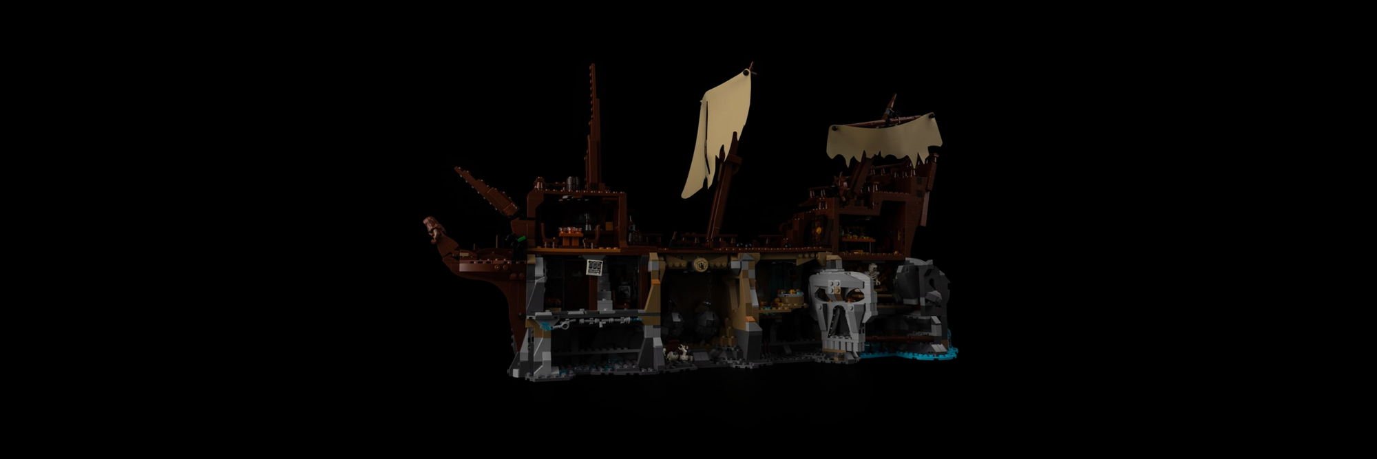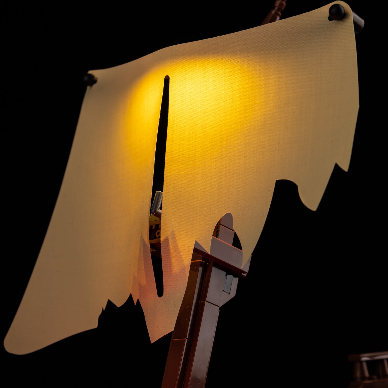 Soft illumination through the tattered sail creates a ghost-ship effect that adds cinematic atmosphere from every angle.
