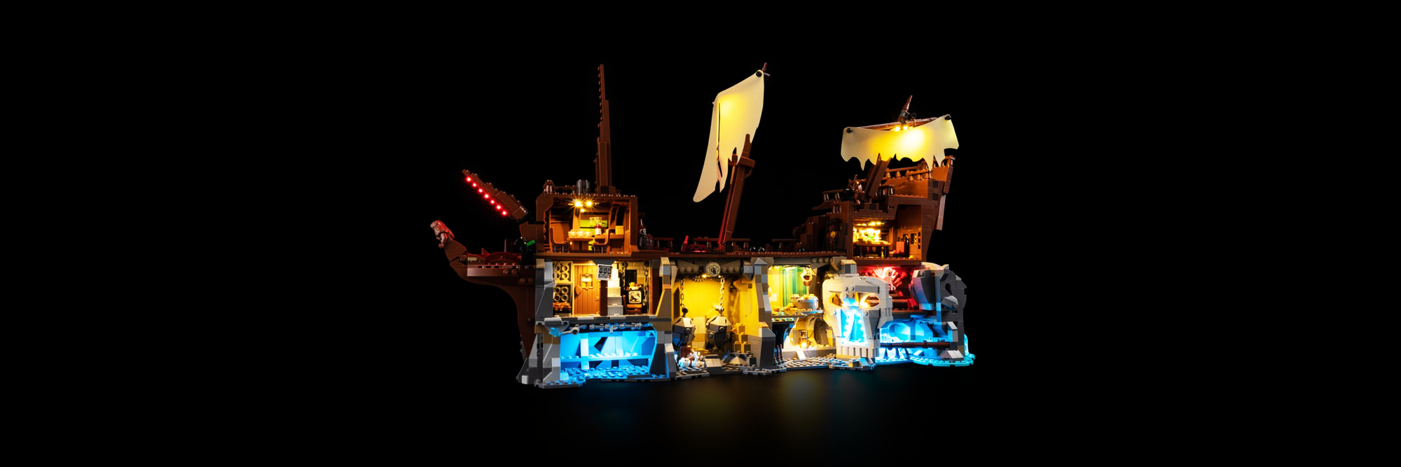 Relive the adventure of The Goonies with LEGO® The Goonies 21363, elevated by Game of Bricks Lights for LEGO® that transform this legendary pirate ship diorama into a cinematic illuminated display.